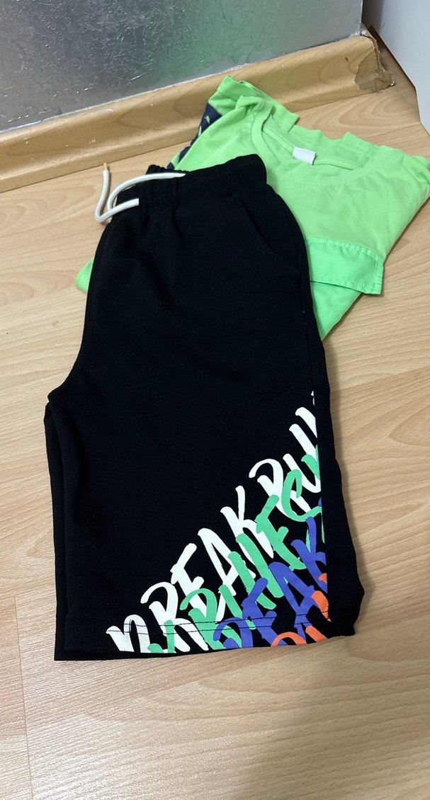 Siyah, bol kesim erkek şort, elastik bel ve bir bacakta renkli tie-dye desenli, sentetik kumaştan üretilmiştir. Günlük kullanım için uygundur.