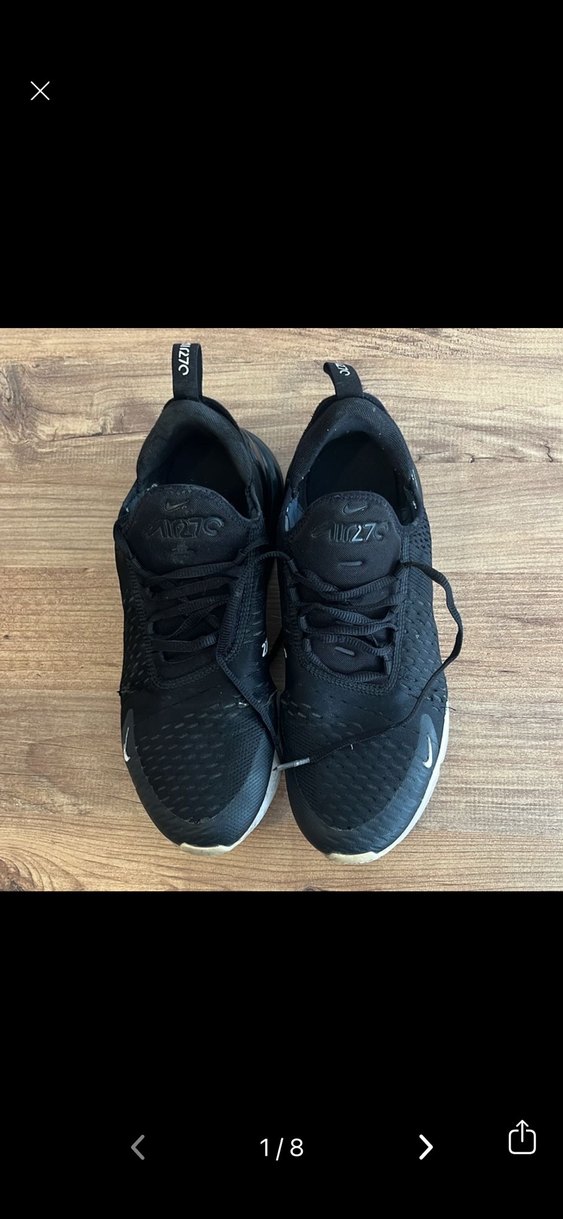 Siyah bağcıklı spor ayakkabılar, lastik tabanlı ve stilettolu topuklu, spor ve sokak stili için uygundur. Trendy günlük kombinler için ideal. Nike marka kusurları gösterilmiştir.