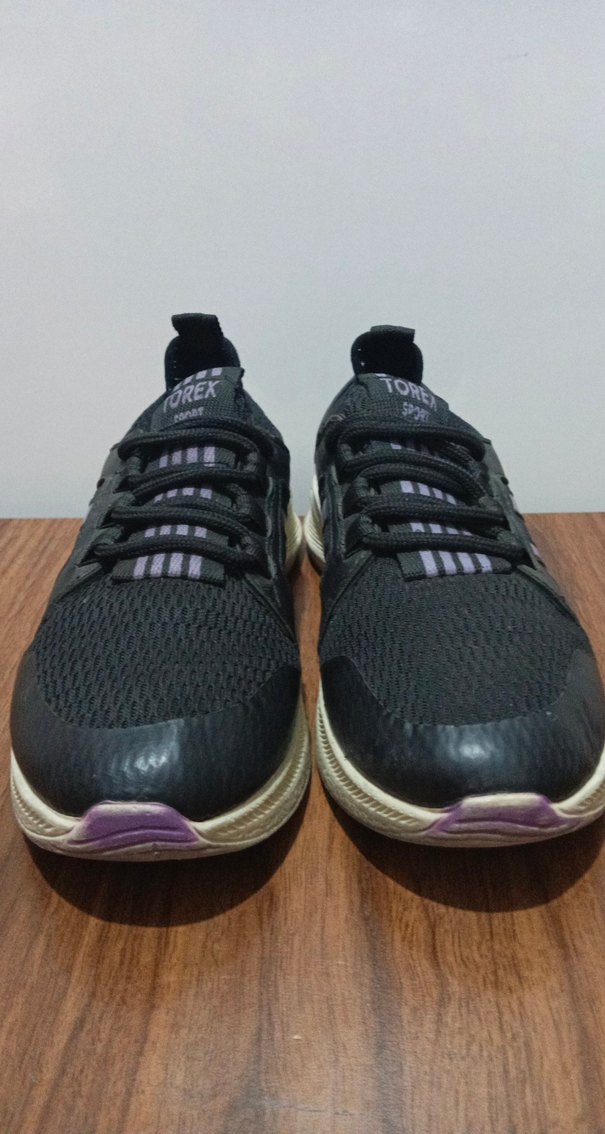 Yumuşak tabanlı siyah bağcıklı spor ayakkabılar, hafif mor detaylarla sokak stiline uygun. Spor ve trend görünümler için ideal.