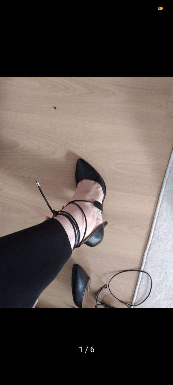 Siyah bağcıklı stiletto topuklu ayakkabılar, kauçuk malzemeden üretilmiştir. Klasik ve gotik tarzı bir araya getirir, romantik akşamlar için uygundur. kullanıldı iplerinde az soyulma var fotoda belirgin