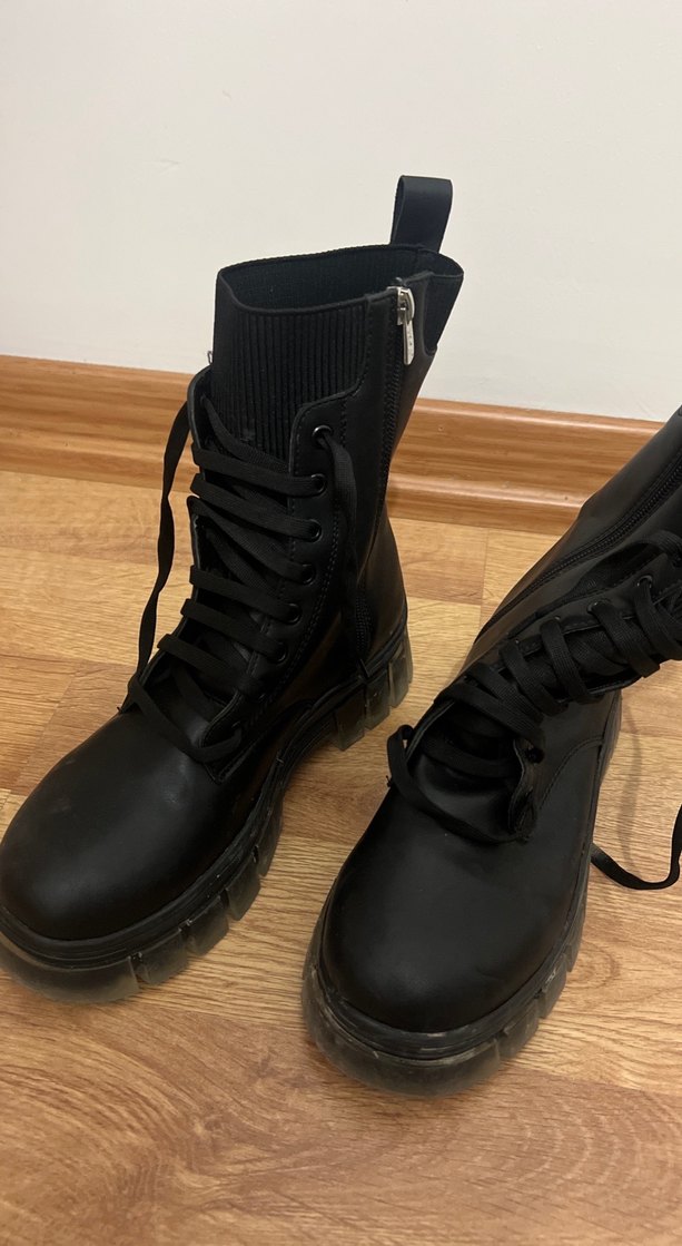 Siyah kauçuk botlar, stiletto topuklu, bağcıklı ve yan fermuarlı. Trendy gündelik sokak stili için uygun.