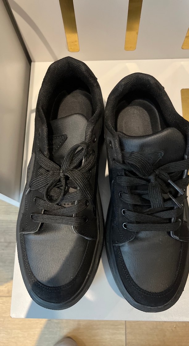 Siyah renkte, bağcıklı ve stiletto topuklu kadın spor ayakkabısı. Kauçuk malzemeden yapılmış, günlük ve sokak stiline uygun.