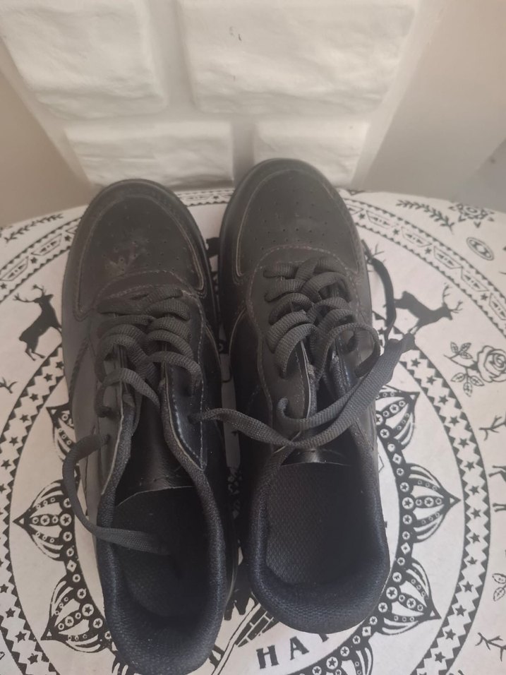 38 numara Siyah bağcıklı, stiletto topuklu kadın spor ayakkabısı, koyu renkli ve desensiz kauçuk malzemeden yapılmıştır. Günlük sokak stili için uygundur.