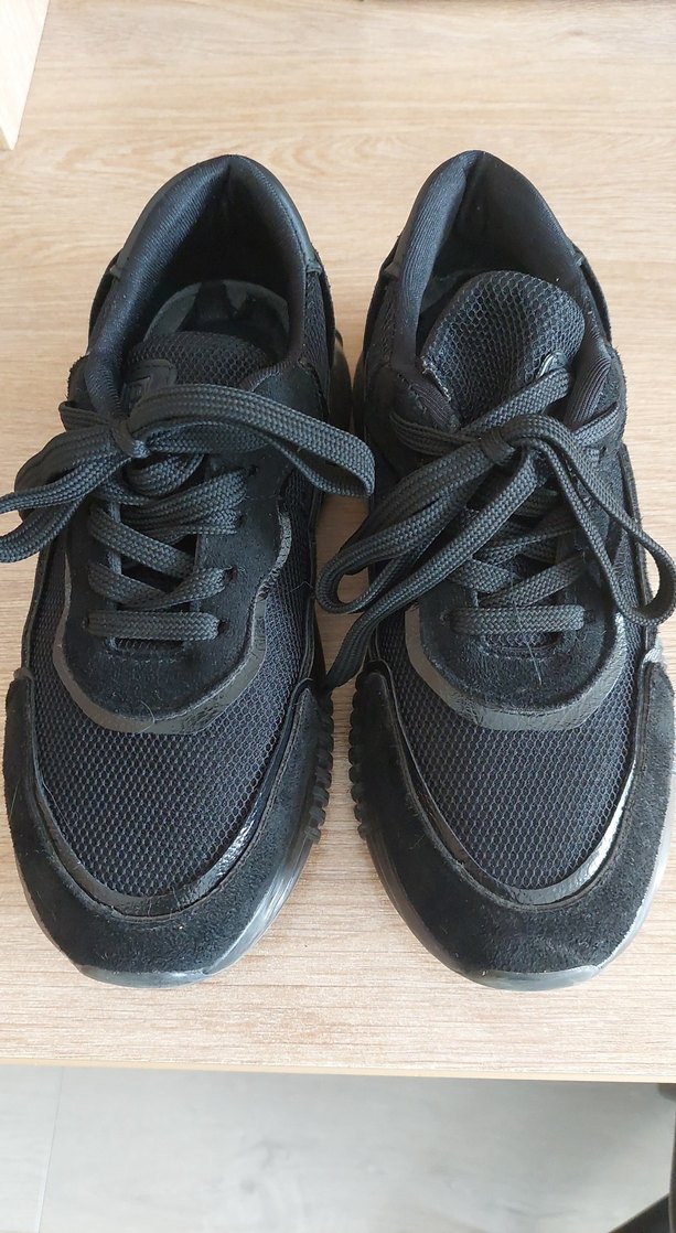 Siyah bağcıklı, stiletto topuklu kadın spor ayakkabısı. Kauçuk tabanlı, spor ve sokak giyimine uygun.