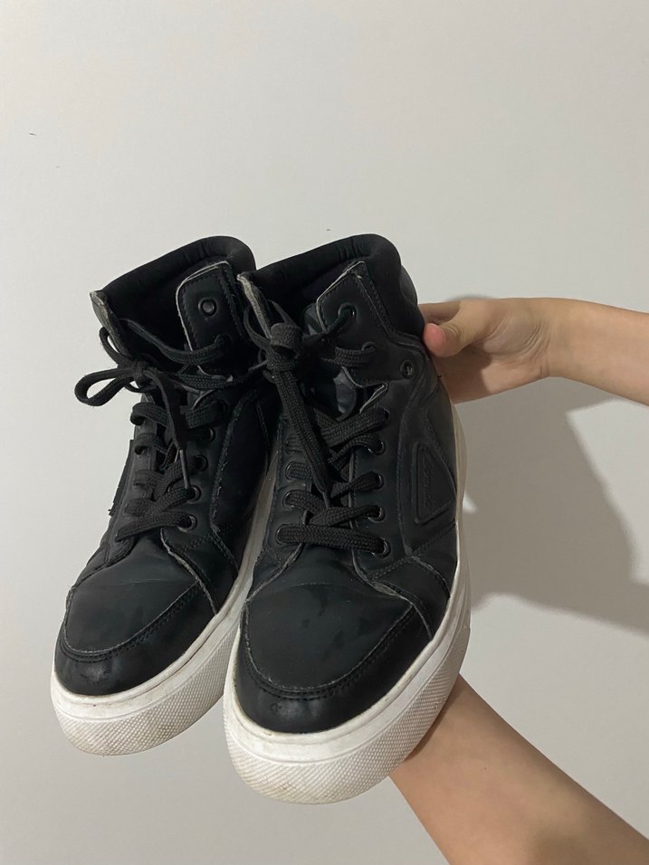 Siyah bağcıklı, stiletto topuklu ve kauçuk tabanlı kadın spor ayakkabısı. Günlük kullanıma uygun, trend bir görünüm sağlar.