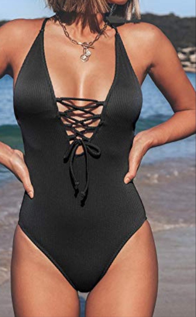 Siyah, bağcıklı ön detaylı ve strappy askılı, vücuda oturan mayo, cesur ve şık bir plaj görünümü sunar.