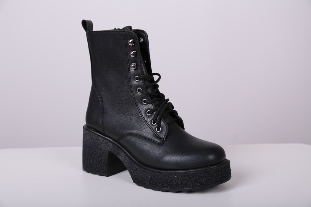 Siyah bağcıklı ve platform topuklu gotik tarzda, günlük kullanıma uygun rock punk havası taşıyan botlar.