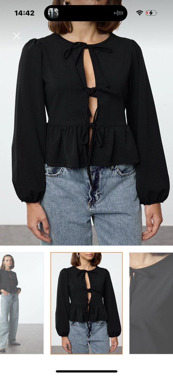 Siyah denim kumaştan, bol kesim, V yakalı, uzun kollu ve bağcıklı bel detaylı bluz. Bağcıklı ve normal midi boyda, günlük sokak tarzına uygun.