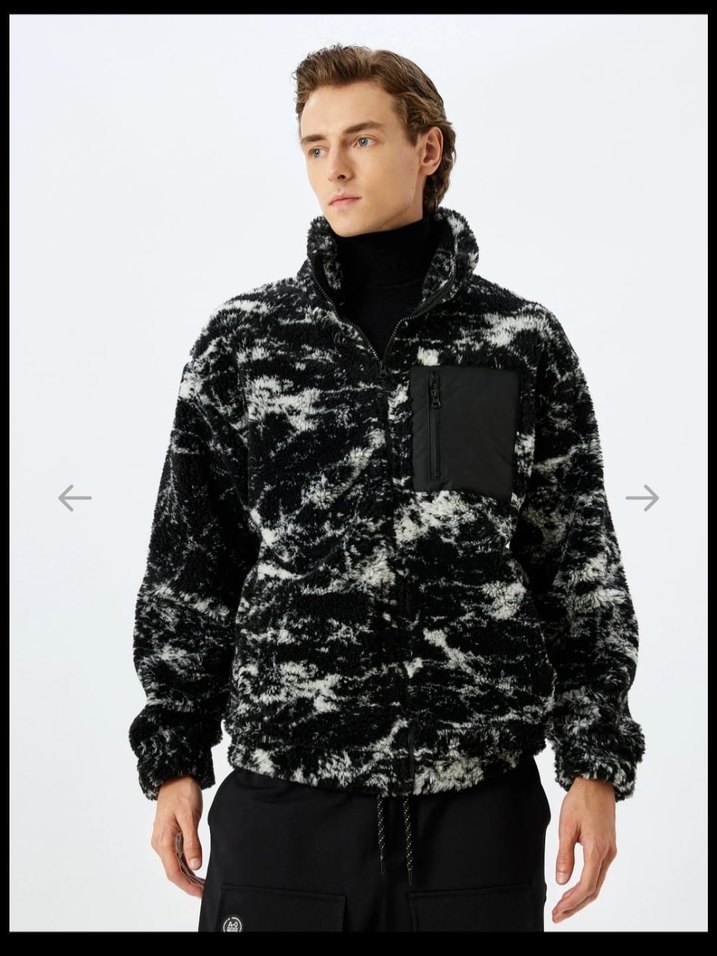 Siyah bağcıklı, yüksek yakalı, kürk detaylı ve bağlama desenli bu ceket, uzun kollu ve bol kesimdir. Yumuşak, sıcak kumaştan yapılmıştır ve göğüs cebinde fermuar bulunur. Fermuarı bozuk sadece o yüzden fiyatını ucuz tutuyorum