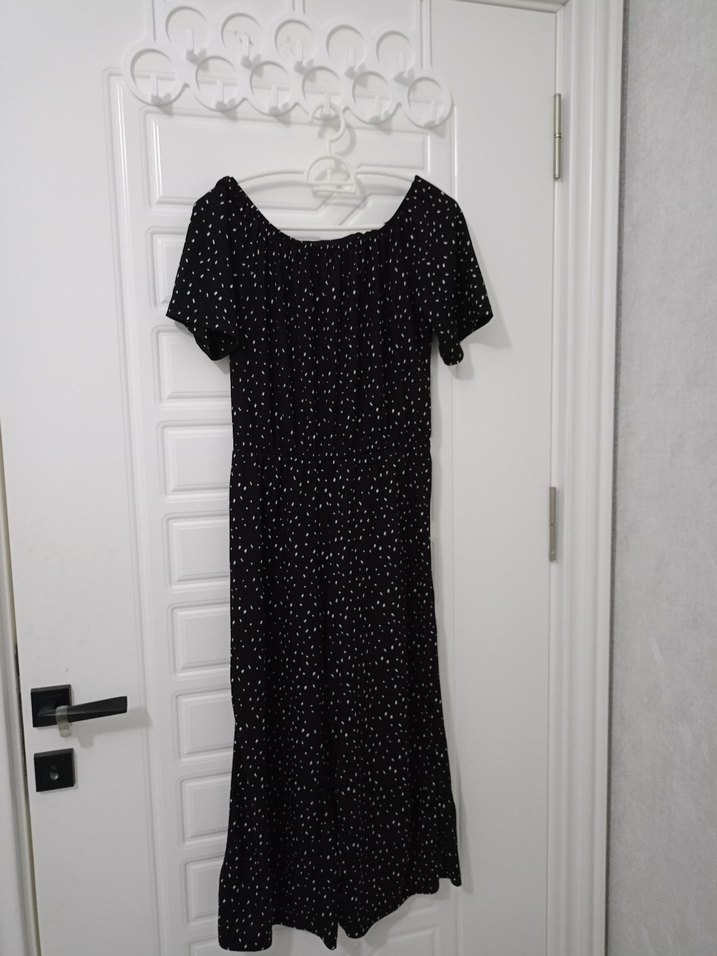 Tekne yaka, kısa kollu, fit kesim siyah bağlama desenli tulum. Yumuşak sentetik kumaştan, fırfır detaylı, günlük kullanıma uygun.