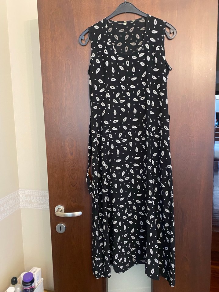 Siyah, bağlama desenli, dökümlü ve V yakalı kolsuz uzun elbise. Sentetik kumaştan, rahat kesimli, gündelik kullanım için uygundur.