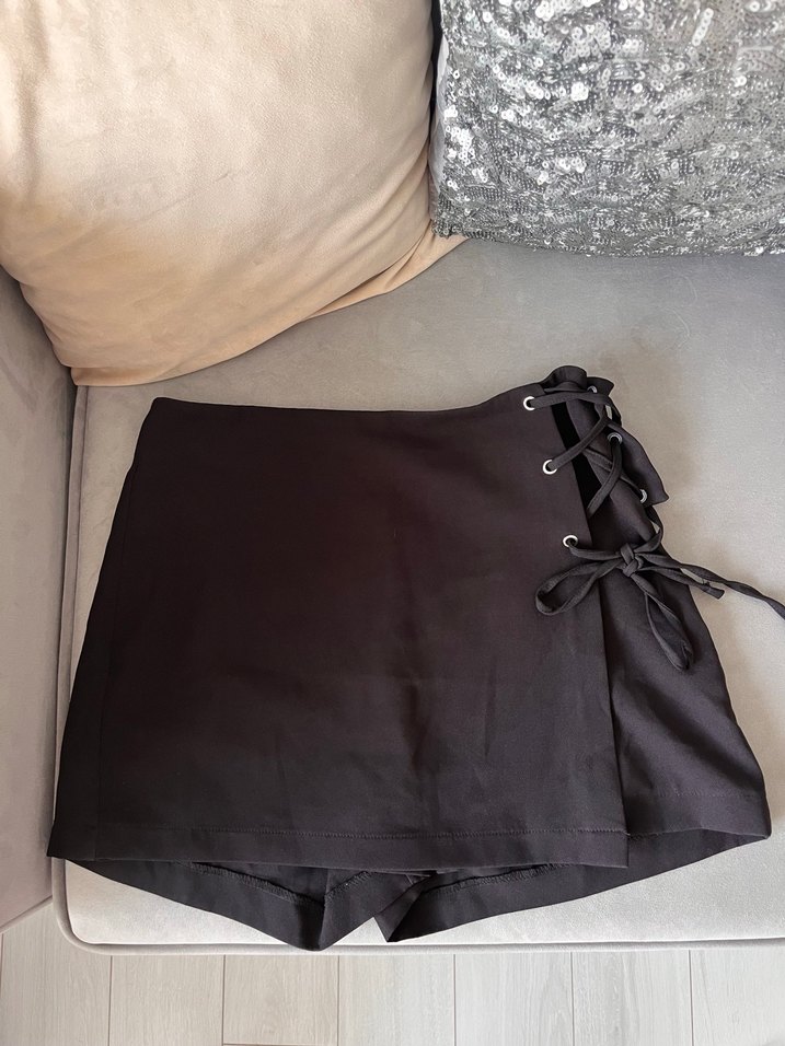 Siyah Bağlama Kuş Gözü Detaylı Şort Etek