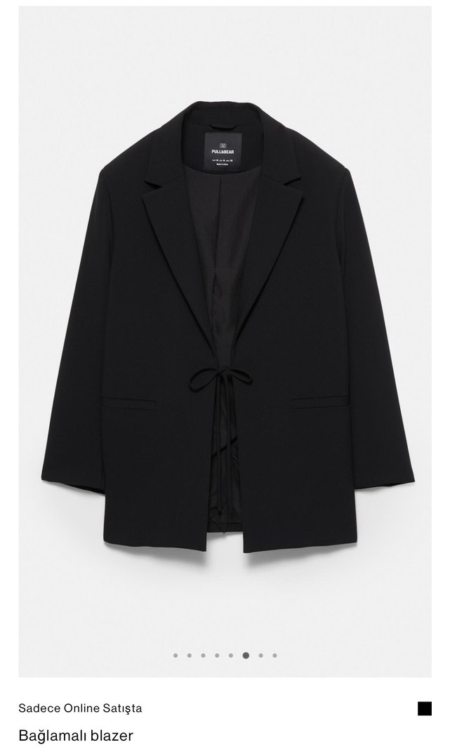Kadın siyah blazer ceket, bağlama detaylı yakası kesik detaylıdır. Askılı kolları ve normal kesimiyle ofis için uygundur.