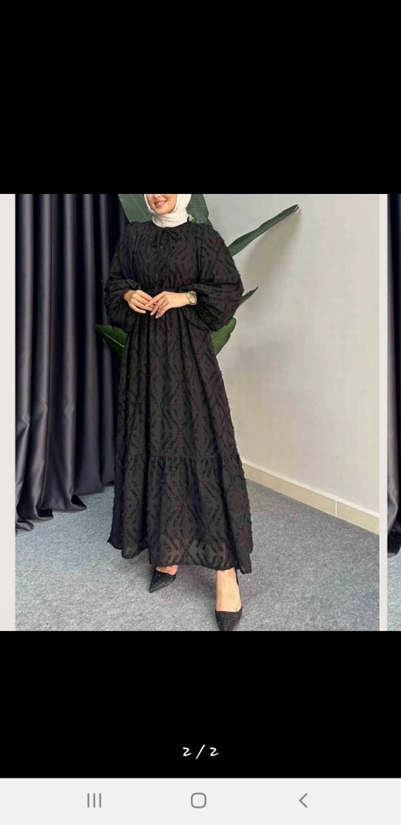 Yüksek yakalı, askılı kollu ve bağlamalı desenli siyah uzun elbise, dökümlü ve sentetik kumaştan üretilmiştir. Mütevazı stil için uygundur.