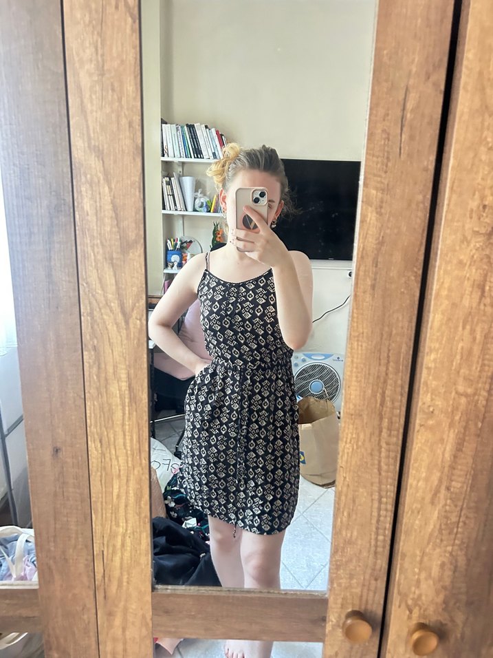 Siyah pamuk midi elbise, bağlamalı ip askılı ve fitted kesimle bohem, rahat şıklık sunar. Koyu tonlu batik desenlidir.