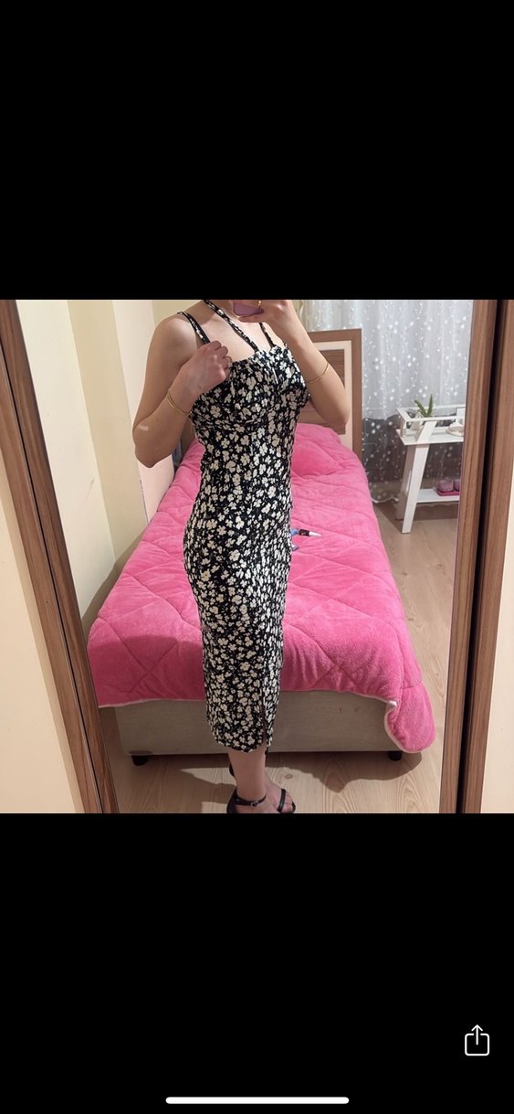 Siyah tonlarda bağlamalı askılı, detaylı midi boy, vücuda oturan elbise. Yumuşak sentetik kumaştan üretilmiş, romantik akşamlar için uygun bir seçenek.