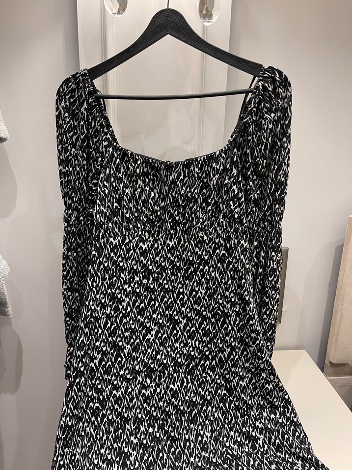 Boğaz kesimli, askılı kollu, siyah bağlamalı desenli, bol kesim, sentetik kumaştan uzun pliseli kadın elbisesi.
