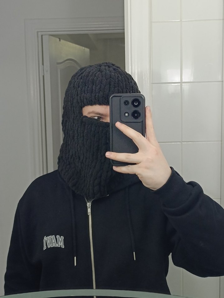 Siyah örgü kumaştan, sıcak tutan ve rock punk havası veren rahat bir balaclava.