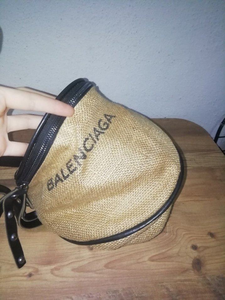 Metal tokalı siyah Balenciaga askılı hasır çanta, sokak ve grunge punk tarzını yansıtıyor. Kumaş üzerinde belirgin marka yazısı bulunur.