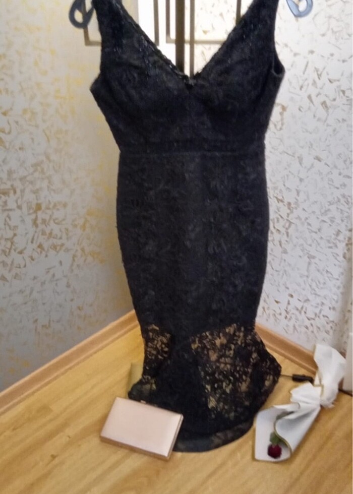Ürün bir kez giyildi balık model güpürlü dantelli şık siyah abiye gece elbısesı