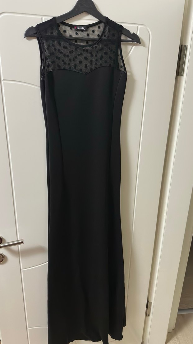 Siyah balık model uzun ve kolsuz, degaje bölümü siyah puantiyeli tül detaylı. Zarif, şık ve modern bir abiye elbise.