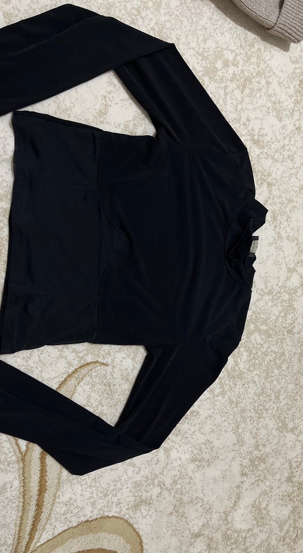 Siyah balıkçı yaka, uzun kollu ve vücuda oturan bluz. Düz siyah ve sentetik kumaştan, günlük kullanım için uygun şık ve rahat bir parça.