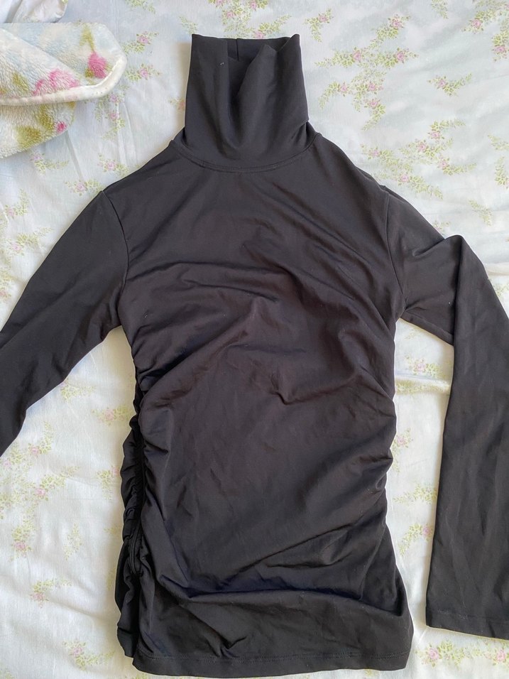 Siyah, balıkçı yakalı, uzun kollu ve vücuda oturan hamile bluzu. Yanlarda drapeli detaylar ve yumuşak sentetik kumaş kullanılmış. Outdoor kullanım için uygun.