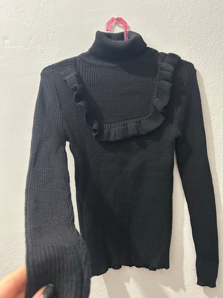 Siyah balıkçı yaka ve önünde fırfır detayı bulunan, triko kumaştan yapılmış, uzun kollu, fitted kesim rahat ve gotik tarzda kadın kazak.