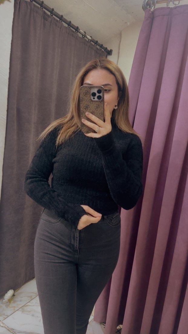 Siyah, ince triko kumaştan, balıkçı yaka ve uzun kollu, günlük kullanıma uygun rahat ve şık bir kazak. Normal midi boyda ve desensizdir.