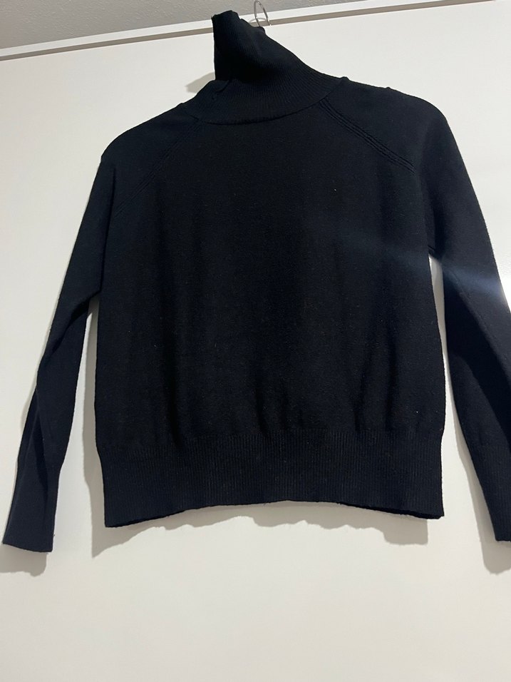 Siyah balıkçı yaka, uzun kollu, fitted kesim yün triko, minimalist ve günlük sokak stili için uygun.