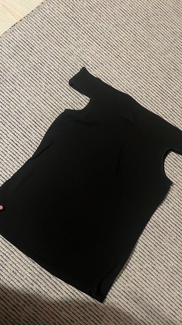 Siyah balıkçı yaka ve kısa kollu, vücuda oturan tişört. Düz, yumuşak sentetik kumaştan yapılmıştır. Günlük kullanıma uygun, midi boyda rahat bir model.