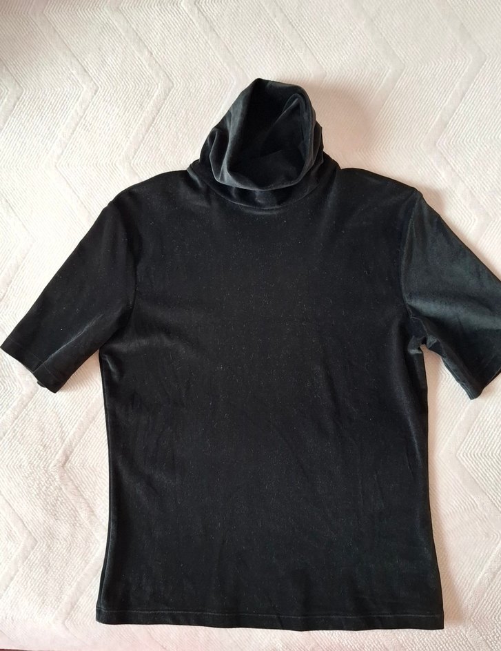 BENETTON Siyah balıkçı yaka ve kısa kollu, yumuşak ve sıcak dokulu kumaştan yapılmış, günlük kullanıma ve abiyeye uygun dar kesim sentetik kadife şık bluz. S beden. Göğüs 85 cm. Hiçbir sakatı yok.
