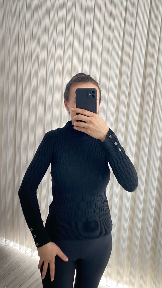 Siyah balıkçı yaka, düğmeli uzun kollu, vücuda oturan örgü kazak. Desensiz, günlük kullanıma uygun şık tasarım.