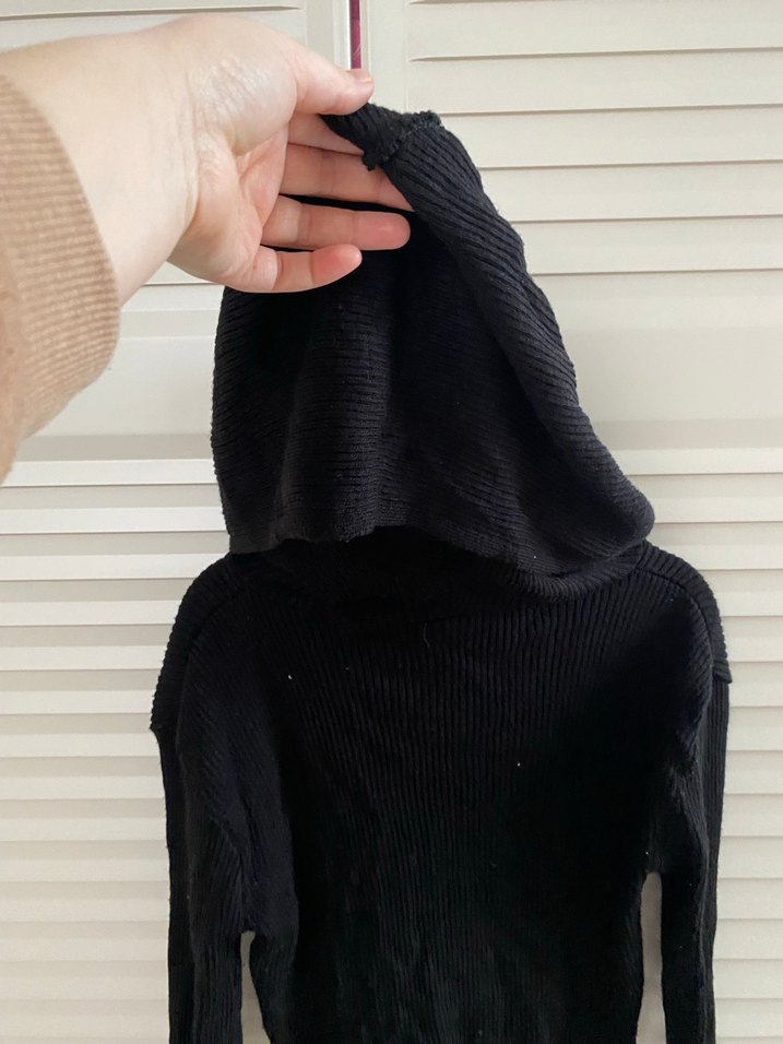 Siyah,kapişonlu ve uzun kollu, triko dokulu kumaştan yapılmış, rahat ve fit kesim kadın hırka.Günlük kullanıma uygun goth tarzda. Üründe kullanıma bağlı hafif tüylenme mevcuttur. Başka bir defosu yoktur. Tüylenmeyi de kendim triko tüylenme aparatı ile temizliyorum.