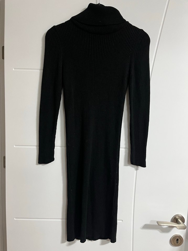 Siyah triko kumaştan, balıkçı yaka ve uzun kollu, vücuda oturan uzun elbise. Minimalist ve gotik tarzda, ofis için uygun.