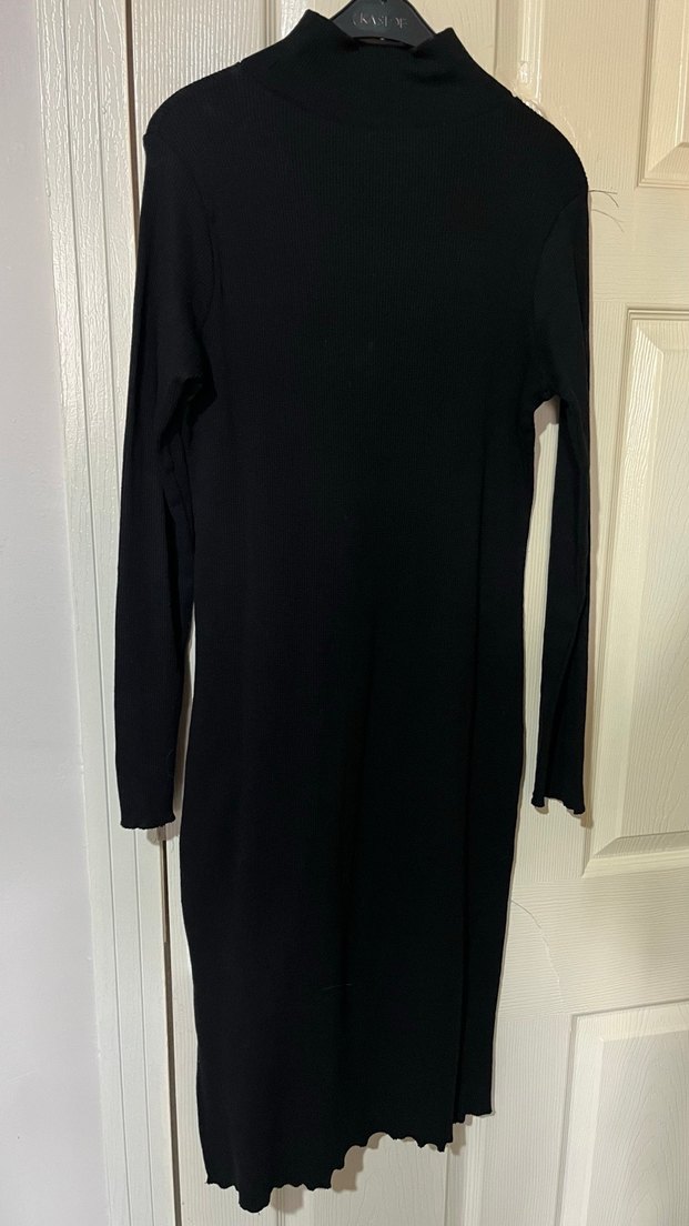 Balıkçı yakalı, uzun kollu, siyah ve vücuda oturan bu uzun elbise, yumuşak sentetik kumaştan yapılmıştır. Minimalist ve gotik tarzıyla ofis için şık bir seçimdir. Bir kere giyildi