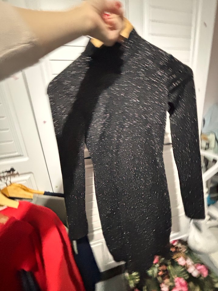 Dar kesim siyah midi elbise, uzun kollu ve balıkçı yakalıdır. Yırtmaç detayıyla sokak modasına uygun, parti için idealdir. ✨