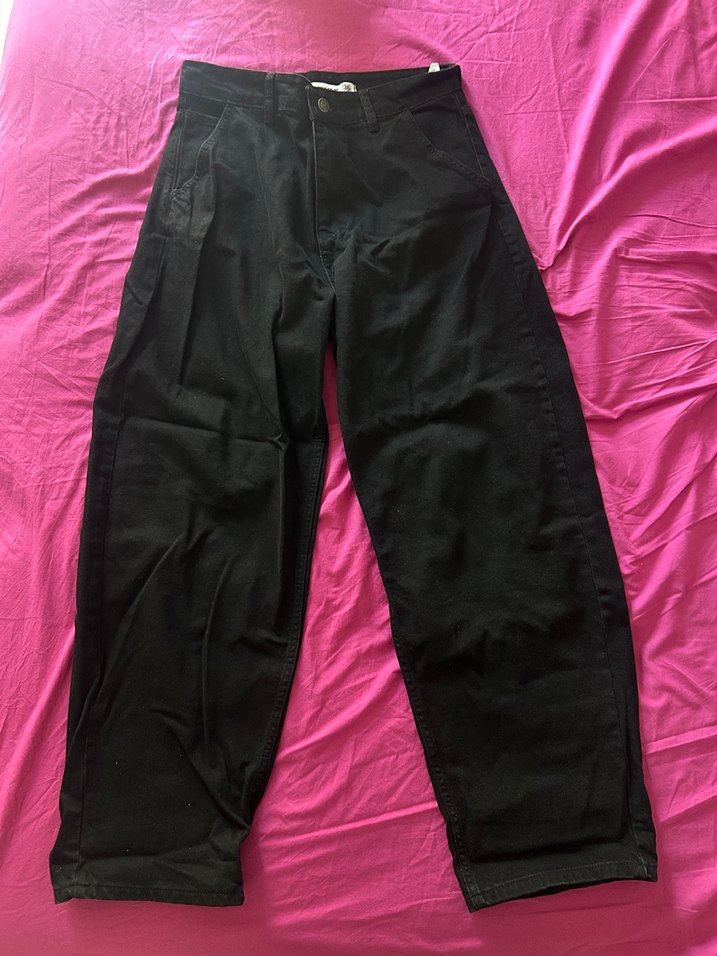 Siyah renk, rahat kesim midi boy kadın kot pantolon. Sentetik kumaştan, şık sokak stili sunar ve günlük kullanım için uygundur.