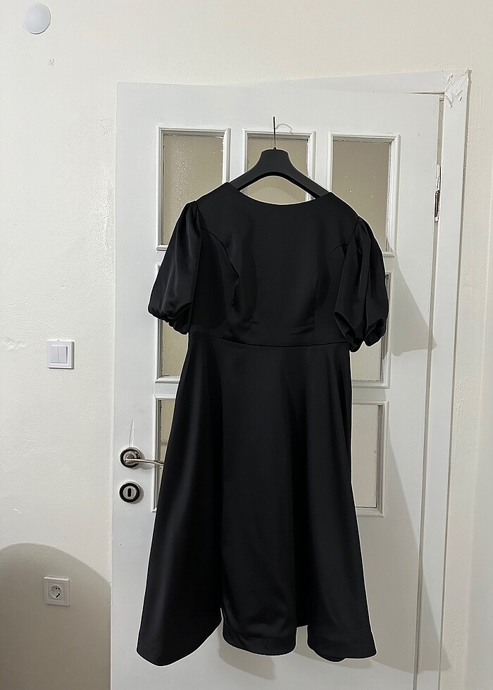 Fotoğraflarda gozuktugu gibidir. Sadece kemer takıldığı yerde Kemerden ötürü 1-2 ip atması var ancak kemer takıldığı zaman belli olmuyor. Balon koldur. Etek ucu kısmındaki kalın biye giyildiğinde dalgalı durmasını sağlıyor. Çok kaliteli güzel bir saten. Ölçüler; önden koltuk altı 54 bel 47 boy 115dir.