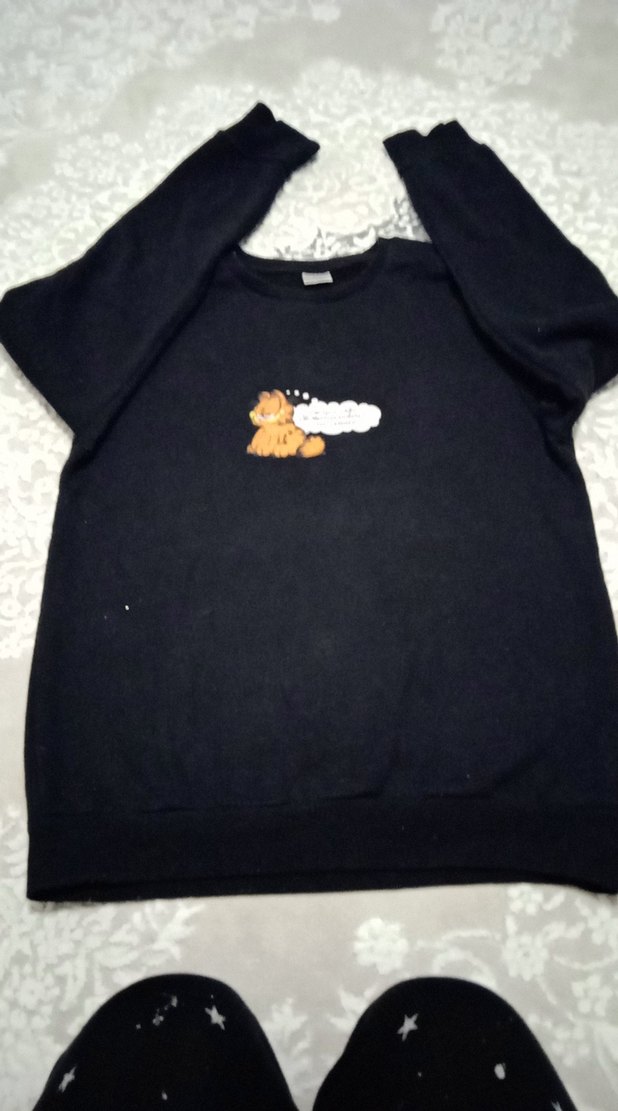 Siyah, bol kesim sweatshirt, kısa balon kollu ve bisiklet yakalı, yumuşak kumaş üzerine baskılı desenli. Günlük kullanım için rahat.