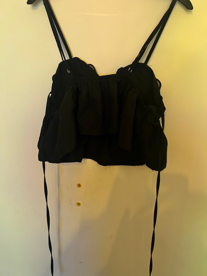 İnce askılı, bantlı siyah büstiyer. Yumuşak sentetik kumaştan, bol kesim. Bir kere giyildi.