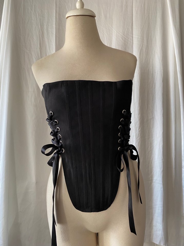 Siyah bantlı ve yanlarında kurdele detaylı, sentetik kumaştan yapılmış, straplez ve vücuda oturan midi uzunluğunda bir büstiyerdir.