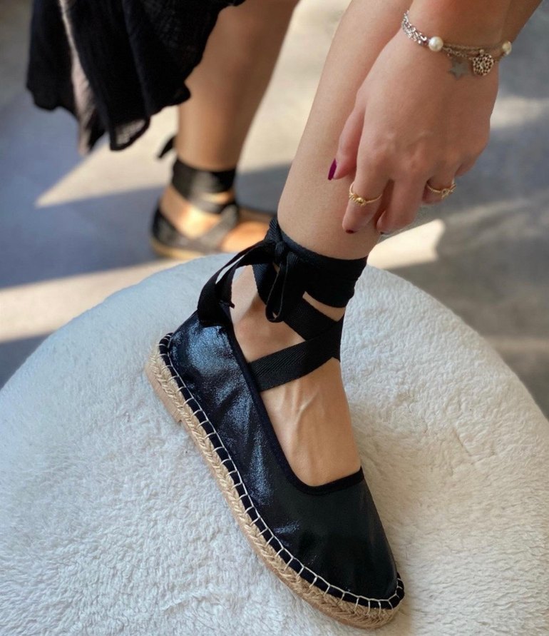 Siyah bantlı kadın espadril, stiletto ve minimal tasarımlı. Günlük kullanıma uygun bohem tarzda, kauçuk tabanlı rahat ayakkabı.