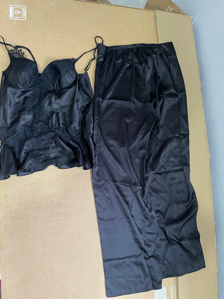 Dantelli bantlı üst ve rahat, hafif kumaşlı pantolondan oluşan siyah, vücuda oturan minimalist goth tarzı kadın pijama takımı.