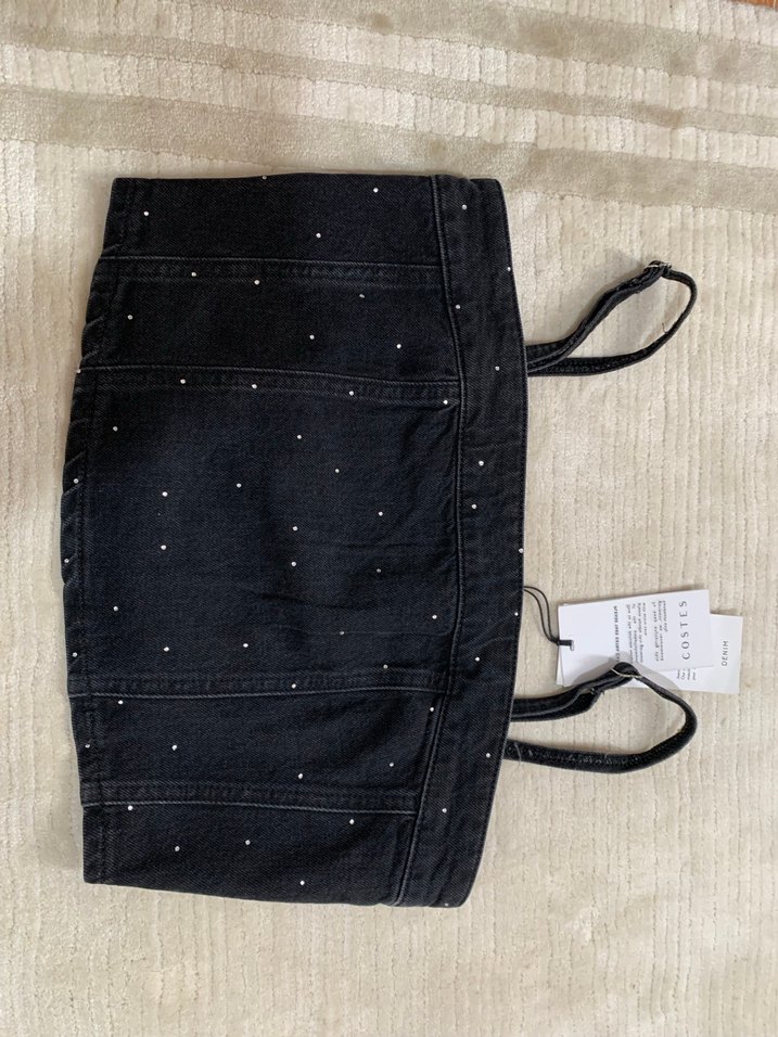Siyah denimden yapılmış, straplez yaka ve ince askılı, bantlı detaylı, baskılı mini crop top. Trendy sokak stili için uygundur. ✨