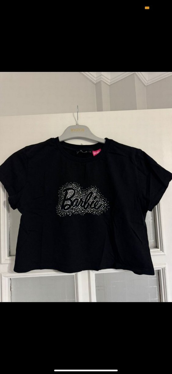 Pamuk kumaştan, kısa kollu ve bisiklet yaka. Barbie baskılı, 1 kez giyildi.