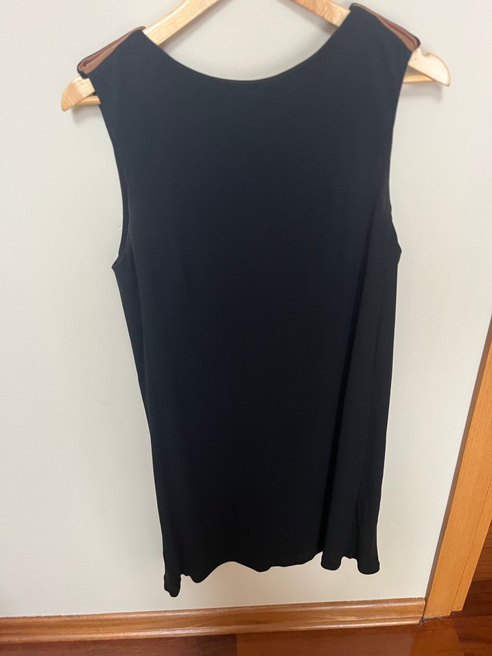 Siyah, kolsuz, V yaka ve bol kesim ipeksi kumaştan, ofis için zahmetsiz şıklık sunar.
