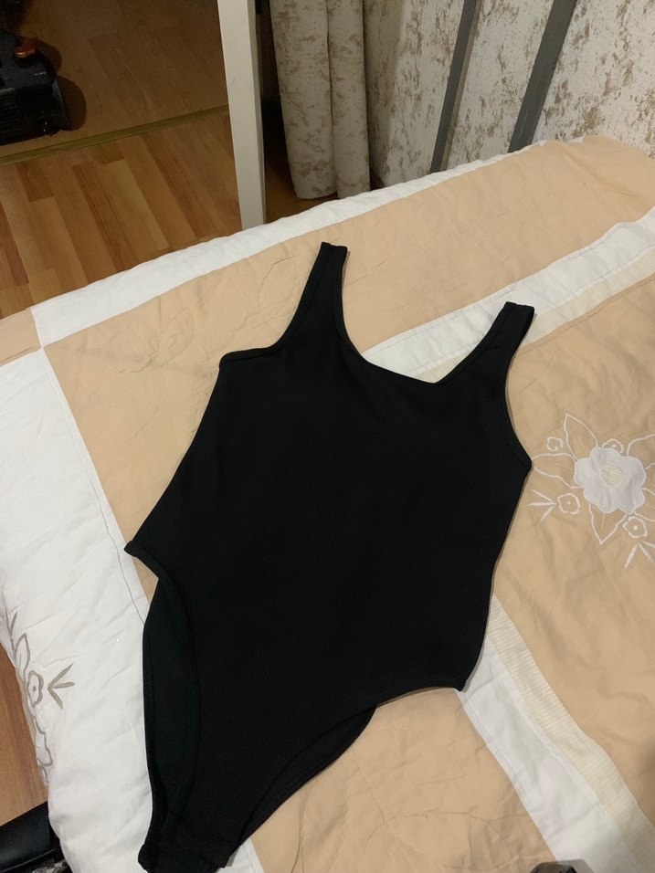 Siyah, kolsuz, vücuda oturan kadın bluz, minimalist tasarımlı ve midi boyda, günlük kullanım için rahat ve şık.