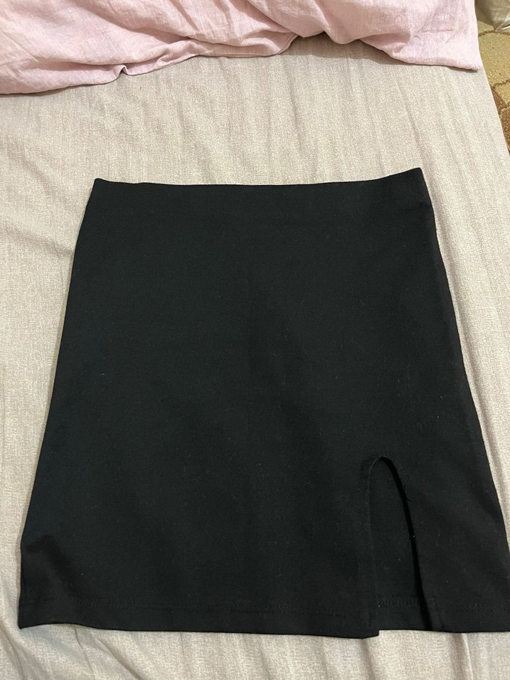 Siyah, sentetik kumaştan yapılmış, dar kesim mini etek. Minimalist ve sokak tarzı sunar, desensiz ve yanında küçük yırtmaç bulunur. Günlük kullanıma uygun.