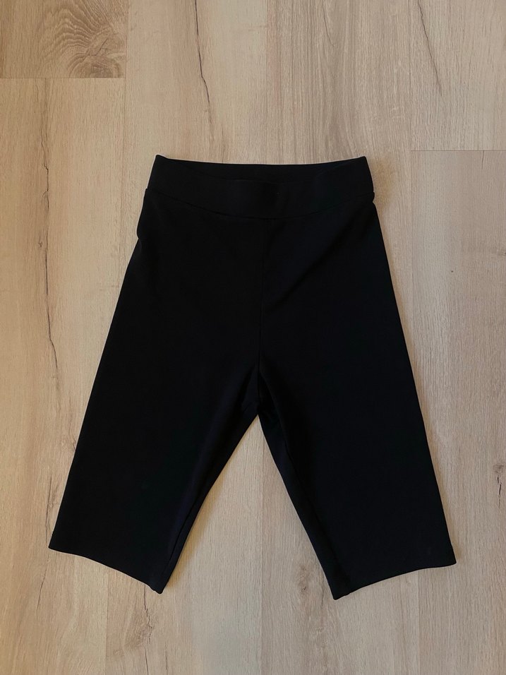Düz siyah, sentetik kumaştan yapılmış, dar kesim mini hamile spor şortu. Spor ve sokak stiline uygun, sade ve şık görünümlü.
